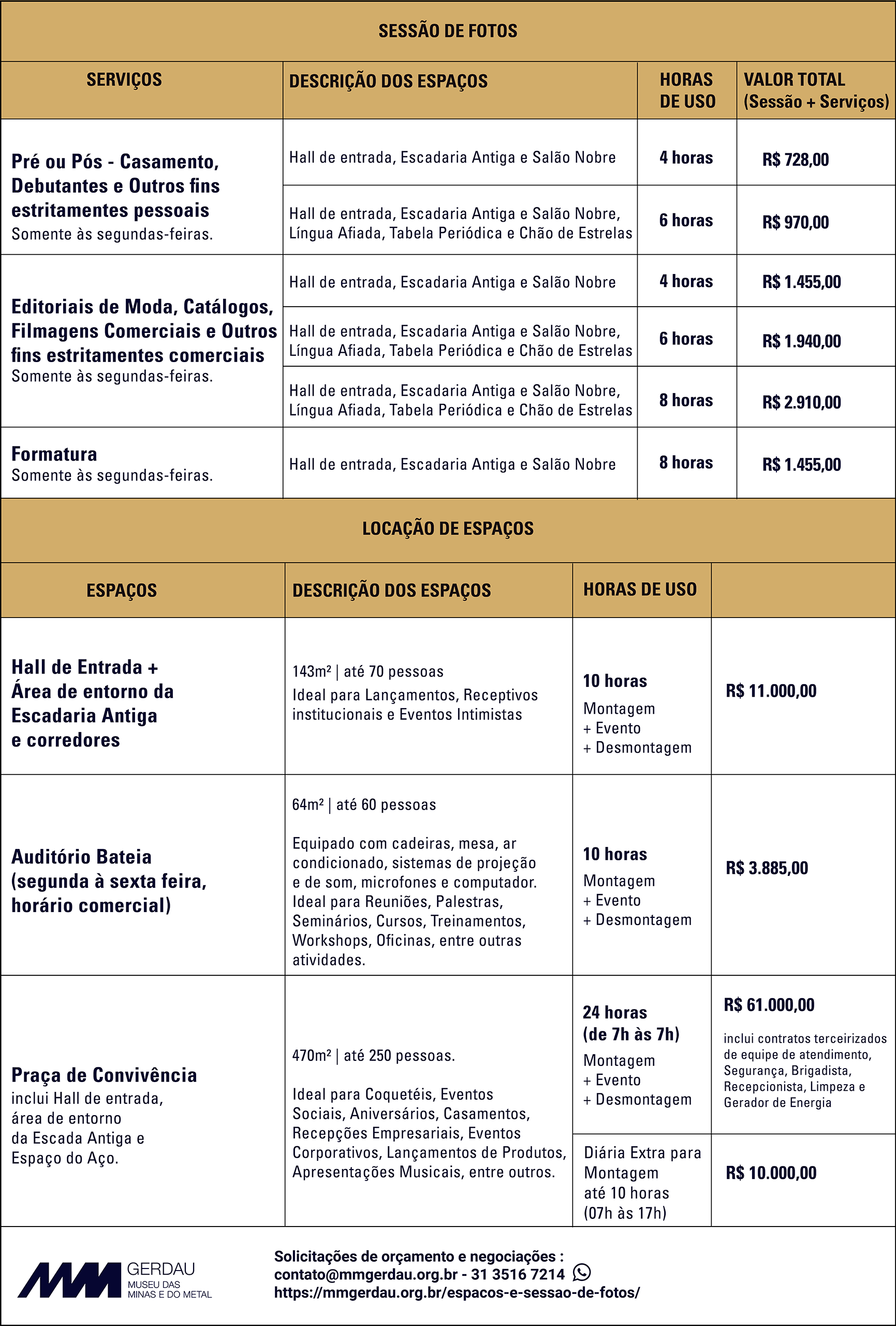 Veja nossa galeria de fotos, conheça as possibilidades de uso dos nossos espaços e tire suas dúvidas pelo WhatsApp📲(31) 3516-7214 ou pelos e-mails: contato@mmgerdau.org.br / eventos@mmgerdau.org.br